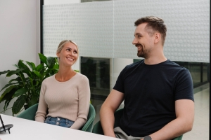 Kuvassa sohvalla Paula Hautamäki, taustalla viherseinä, jossa OmaSp:n logo valkoisella.